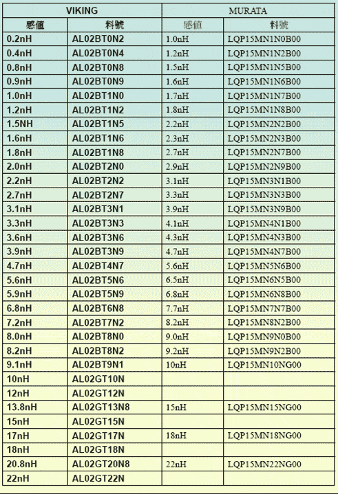 VIKING高频电感和村田LQP系列对应感值表 |