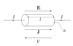 处于均匀外电场的均匀截面导体(例如,电线)。在物理学里,对于物质的微观层次电性质研究,会使用到的欧姆定律,以矢量方程表达为 ;其中,E是电场,P是电阻率,J是电流密度。在导体内任意两点g、h,定义电压为将单位电荷从点g移动到点h,电场力所需做的机械功[1]: ;其中,Vgh 是电压,w 是机械功,q 是电荷量,dl 是微小线元素。假设,沿着积分路径,电流密度 为均匀电流密度,并且平行于微小线元素: ;其中,是积分路径的单位矢量。那么,可以得到电压: ;其中,l 是积分路径的径长。假设导体具有均匀的电阻率,则通过导体的电流密度也是均匀的: J = I/a ;其中,a 是导体的截面面积。电压 Vgh 简写为 V 。电压与电流成正比:。总结,电阻与电阻率的关系为 。假设 J>0 ,则 V>0 ;将单位电荷从点g移动到点h,电场力需要作的机械功 w>0 。所以,点g的电势比点h的电势高,从点g到点h的电势差为 -V 。从点g到点h,电压降是 V ;从点h到点g,电压升是 V 。交流电假设电线传导的电流是高频率交流电,则由于趋肤效应,电线的有效截面面积会减小。假设平行排列几条电线在一起,则由于邻近效应,每一条电线的有效电阻会大于单独电线的电阻。对于普通家用交流电,由于频率很低,这些效应非常微小,可以忽略这些效应。