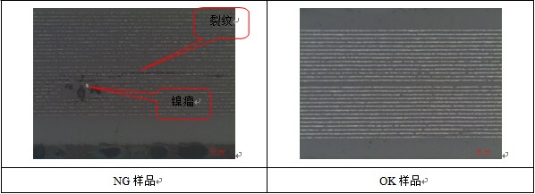 通过外观检查OK样品与NG样品表面均完好,未见裂纹、破损等异常。