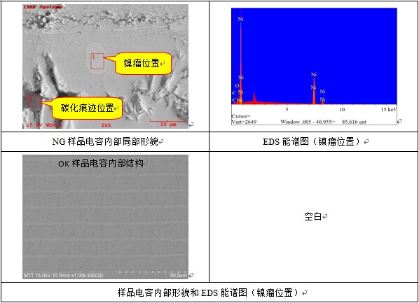 通过对样品剖面SEM/EDS分析, NG样品电容内部电极层不连续,存在明显镍瘤;其镍瘤周围多条向外延伸裂纹并在裂缝通道内发现明显碳化痕迹(EDS结果中C含量高达50%),此应为热应力裂纹,裂纹的存在直接导致电容性能异常;而OK样品电容内部电极层连续,陶瓷介质层致密未发现孔洞及镍瘤,电容性能良好。