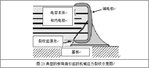 多层陶瓷电容器(MLCC)的特点是能够承受较大的压应力,但抵抗弯曲能力比较差。器件组装过程中任何可能产生弯曲变形的操作都可能导致器件开裂。常见的应力源有:工艺过程电路板流转操作;流转过程中的人、设备、重力等因素;元件接插操作;电路测试;单板分割;电路板安装;电路板定位铆接;螺丝安装等。该裂纹一般源于器件上下金属化端子,沿45°向器件内部扩展,详见图23。