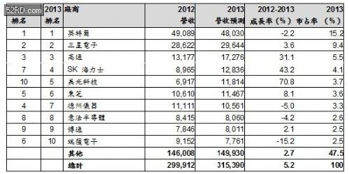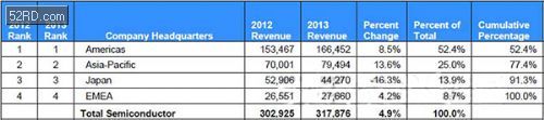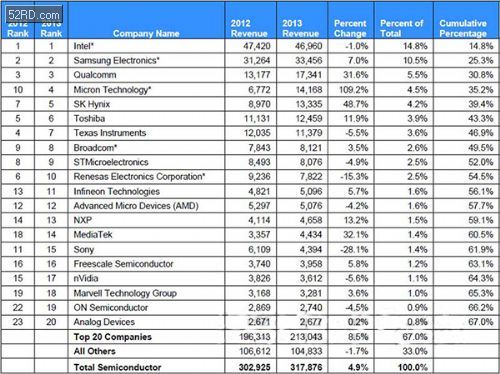 排名前三的企业是英特尔、三星电子、高通,顺序与上年相同(2012年排名)。不过,高通在无线通信领域的销售额提高,市场份额由上年的4.3%提高至5.5%。